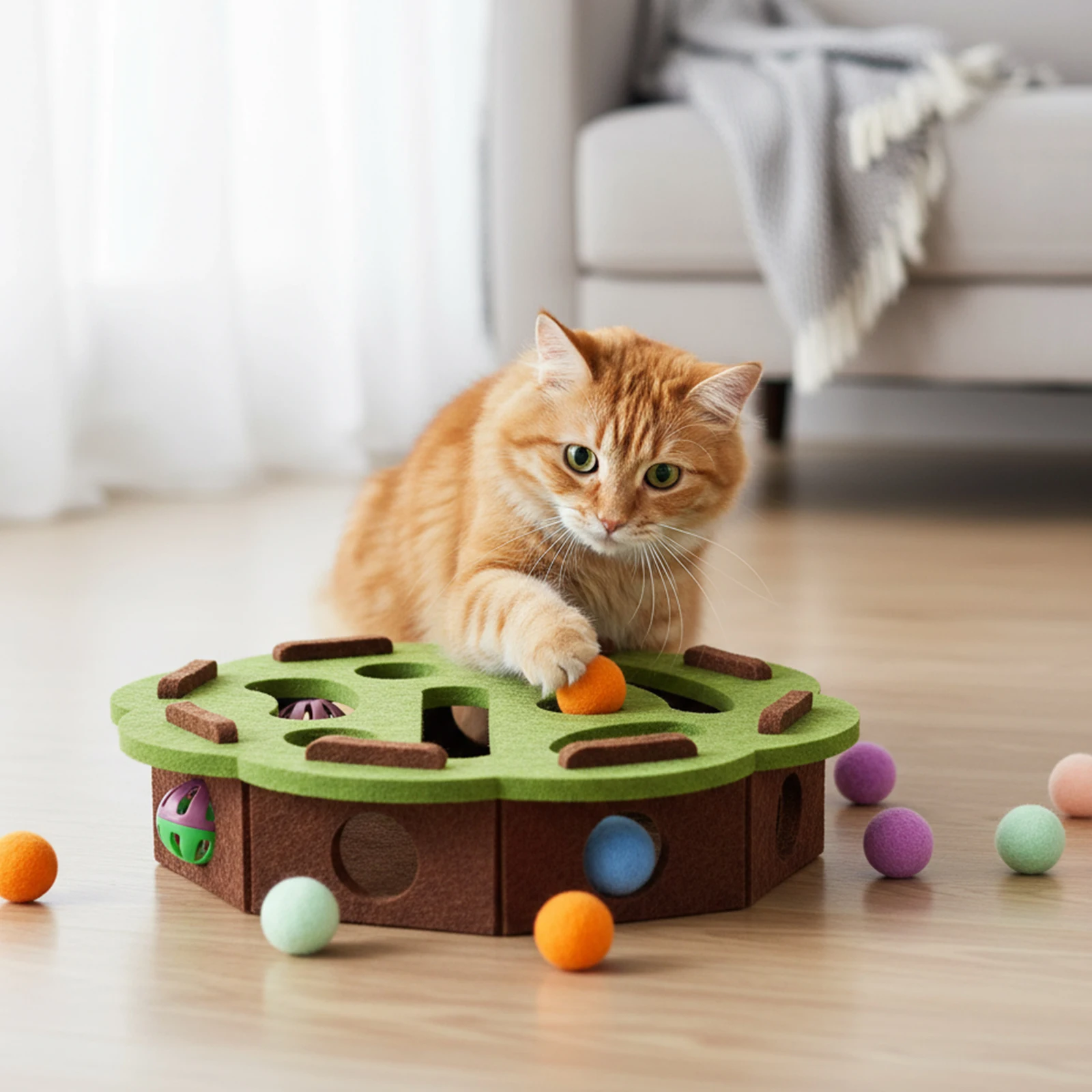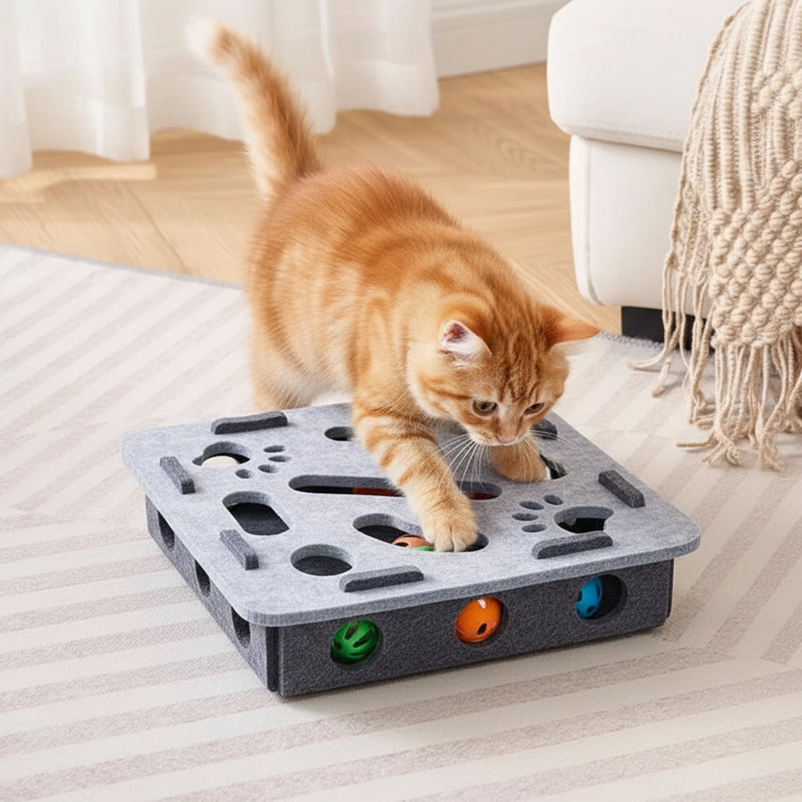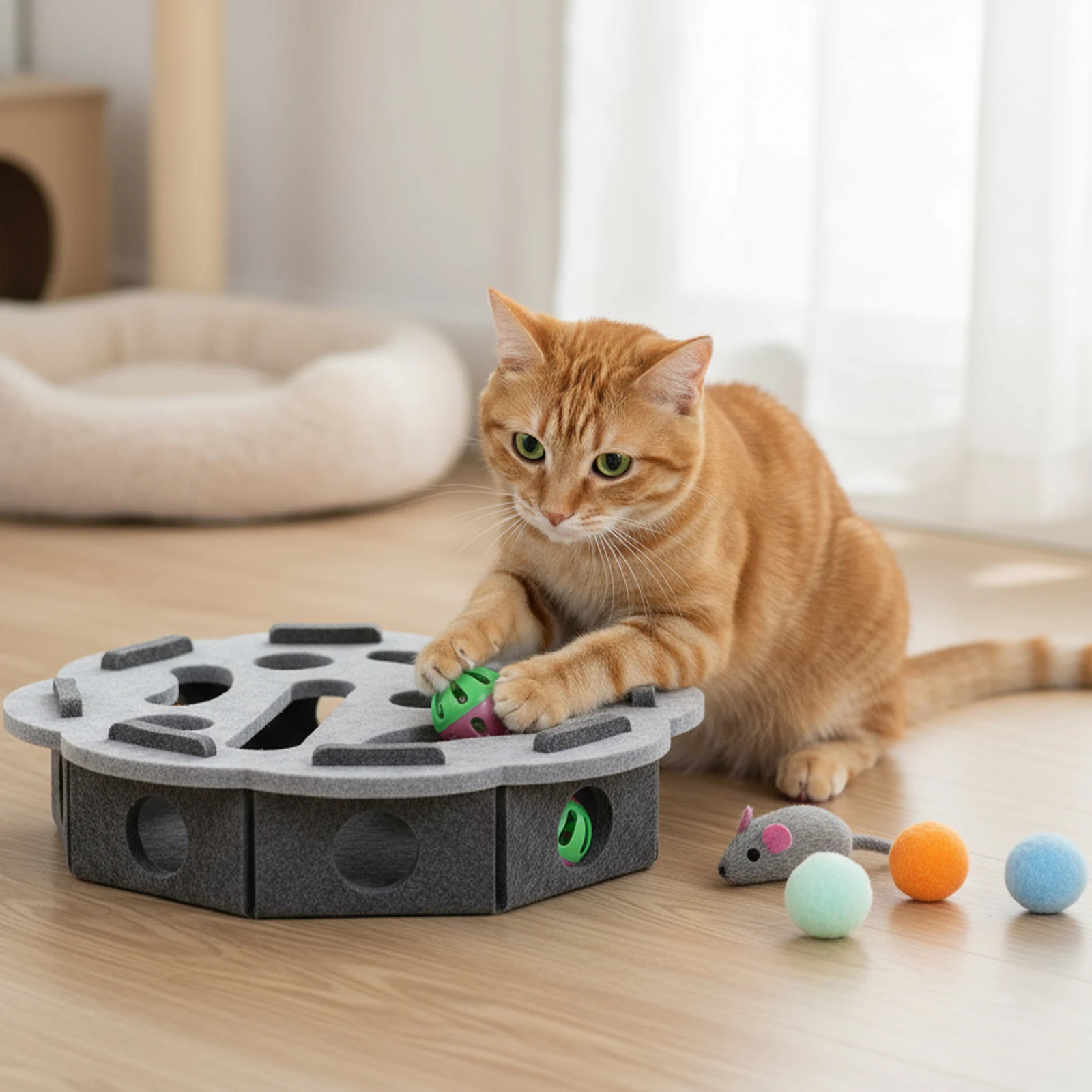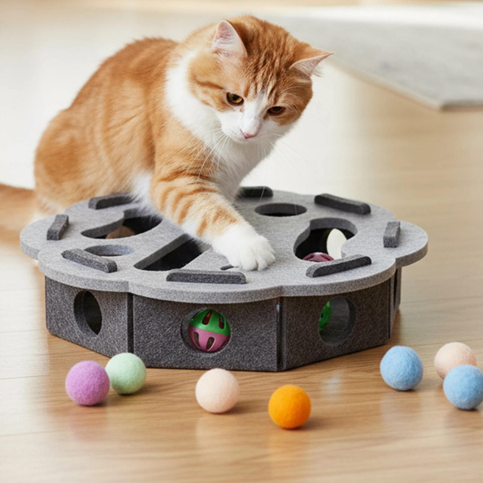 2.Creative Track & Hollow Design Mimics Real Hunting: The felt puzzle box offers diverse tracks and cutouts, letting balls roll freely to simulate prey escape. Cats bat and chase balls through holes, boosting agility and combining play with skill building.