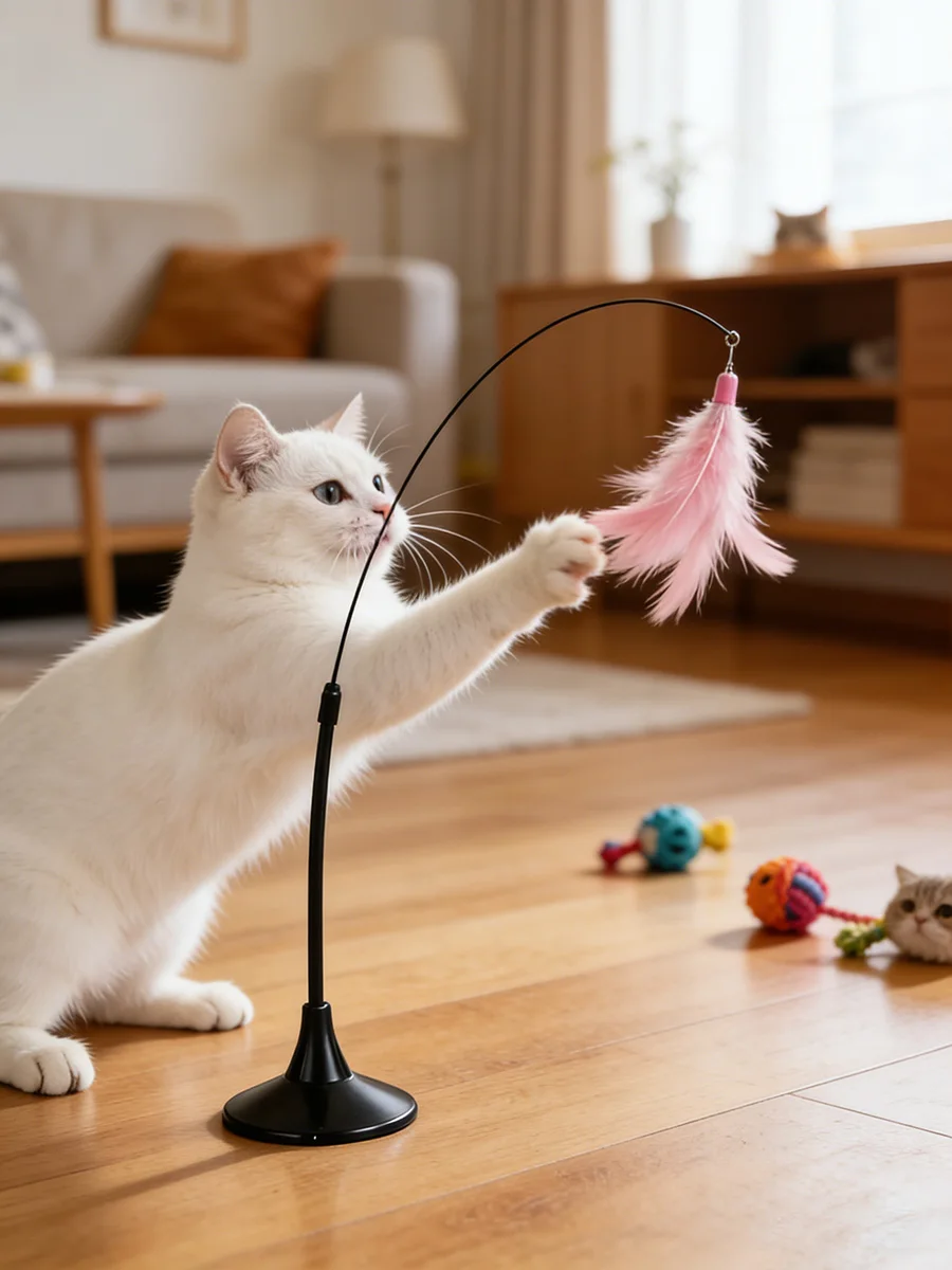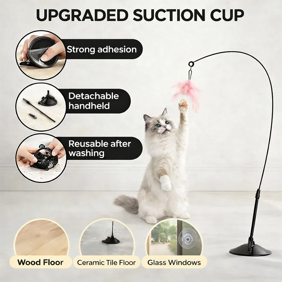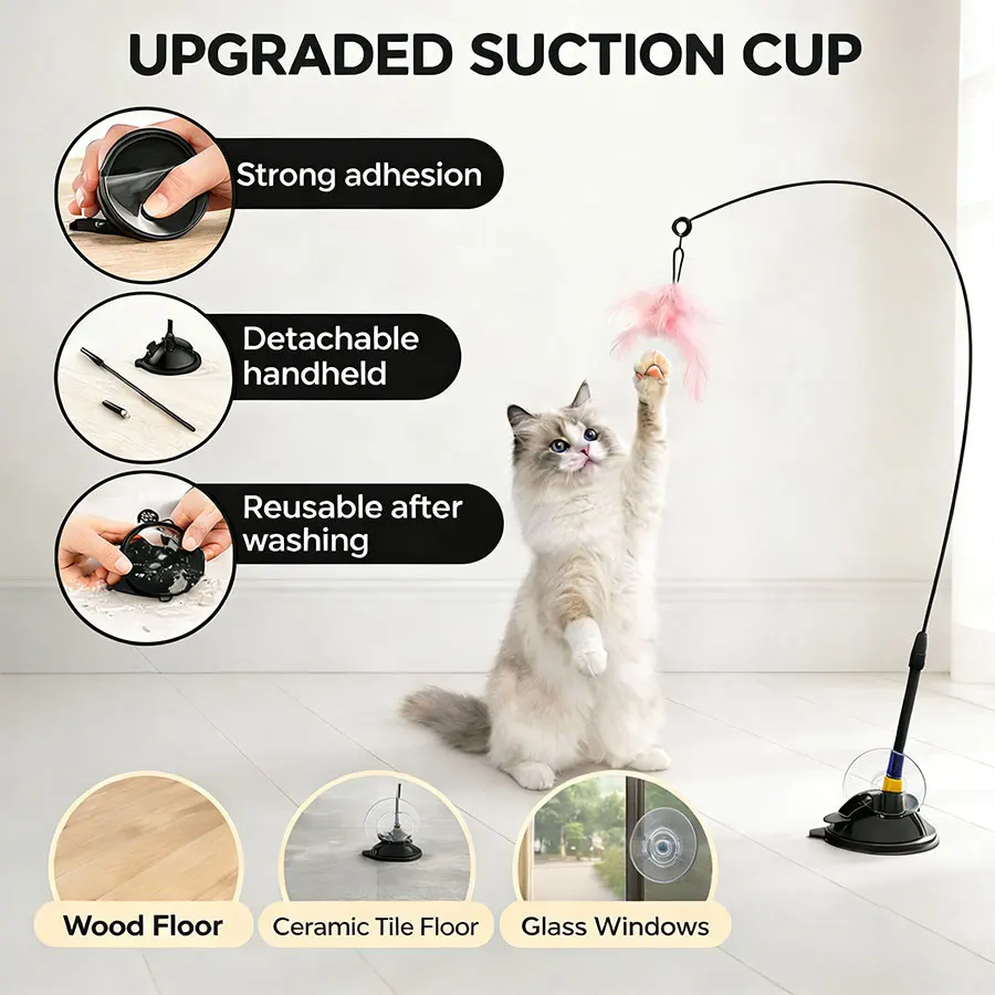 Interactive Cat Teaser Stick with Bell – Extended Rod Strong Suction Cup, Bite-Resistant Hands-Free Indoor Toy for Kittens Cats